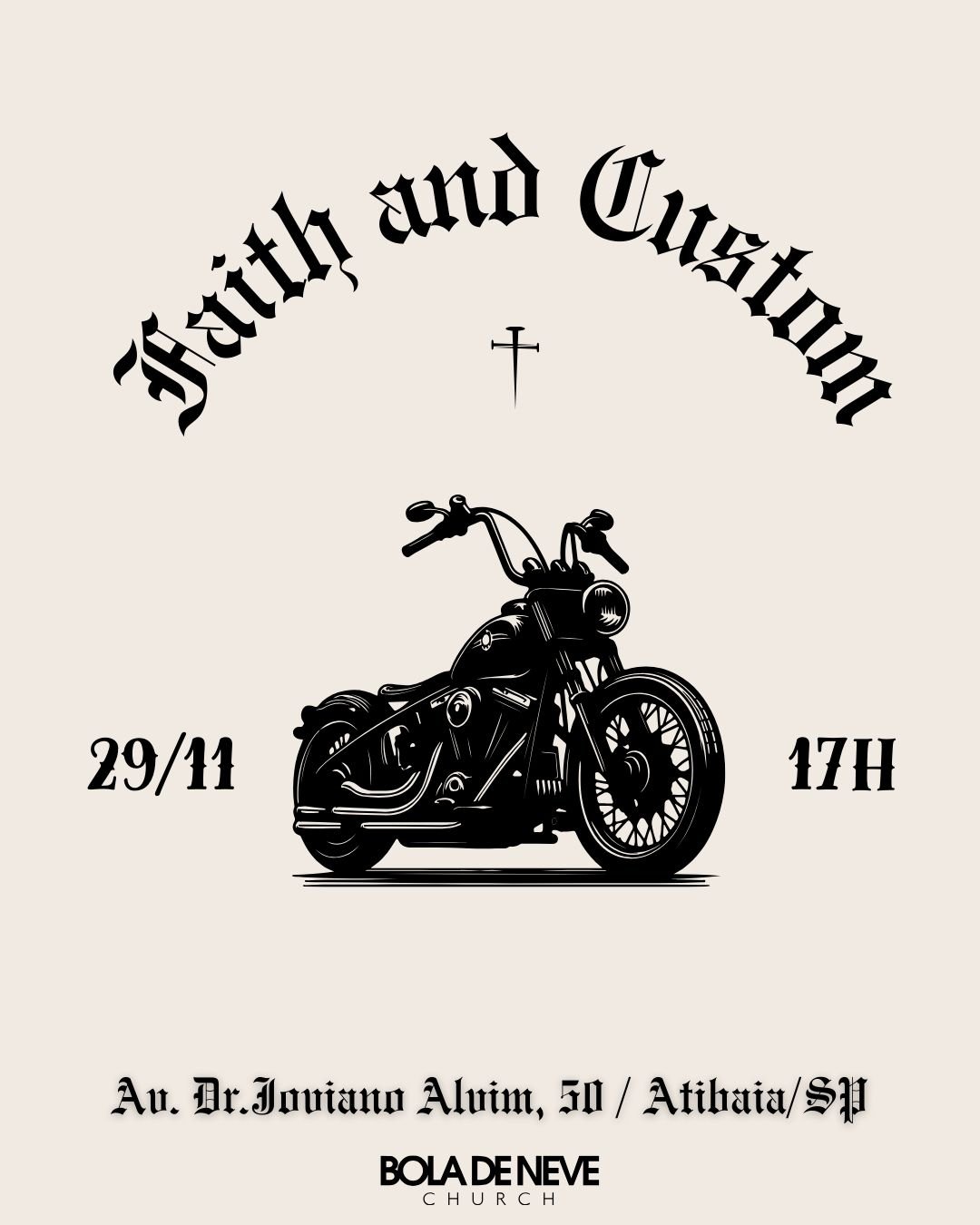 A Igreja Bola de Neve Atibaia promoverá, no dia 29 de novembro, das 17h às 22h, o evento Faith And Custom, iniciativa criada para celebrar o estilo custom e fortalecer a convivência entre apaixonados por motos, carros modificados e o estilo de vida sobre duas rodas. A programação inclui exposição de veículos, gastronomia, música ao vivo, conversas com especialistas e sorteios. A expectativa é atrair cerca de 200 participantes.