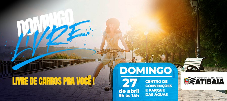 A Prefeitura de Atibaia convida a todos para participar de mais uma edição do Domingo Livre, utilizando roupas leves, protetor solar e boné. Importante levar garrafinhas de água para se hidratar e poder aproveitar ao máximo as atividades.