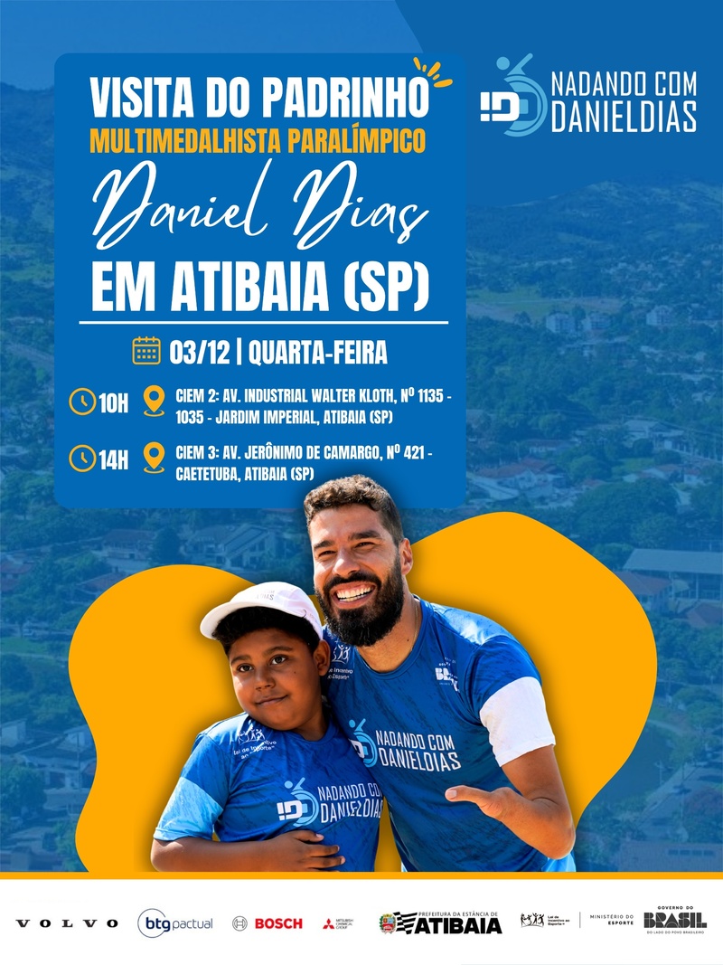 A cidade de Atibaia (SP) se prepara para um dia de muita emoção e aprendizado com a chegada do padrinho multicampeão paralímpico, Daniel Dias, que realizará sua primeira visita oficial aos dois núcleos do projeto Nadando com Daniel Dias. O encontro está marcado para a quarta-feira (03/12) e promete momentos especiais entre o padrinho, os alunos, suas famílias e a equipe técnica.
